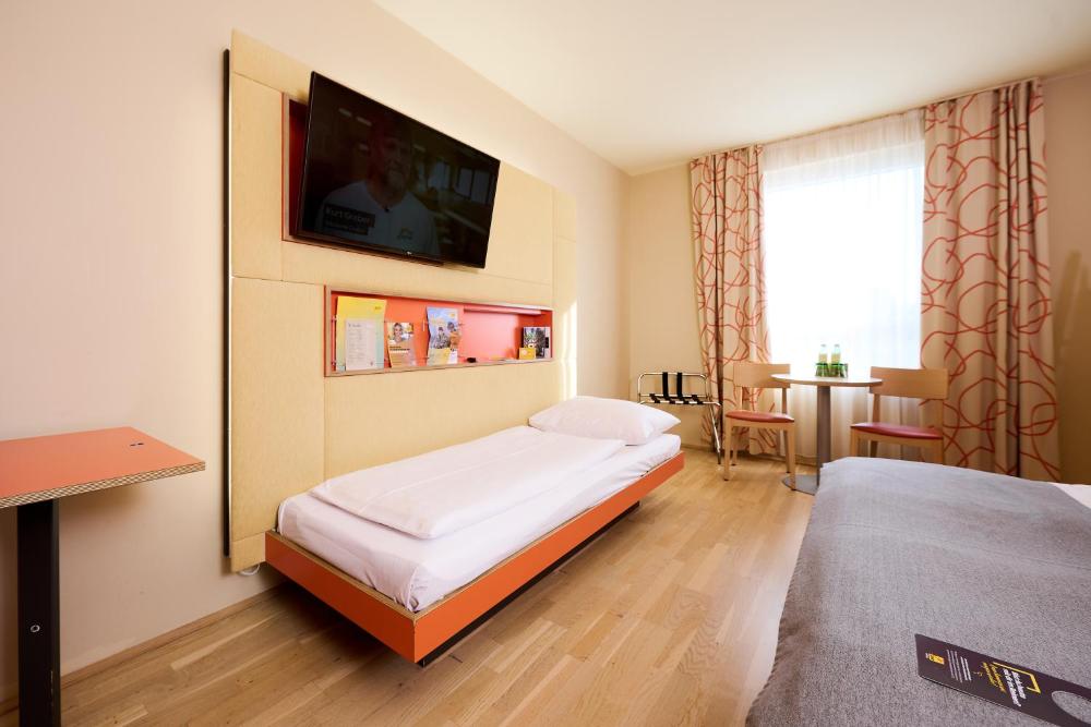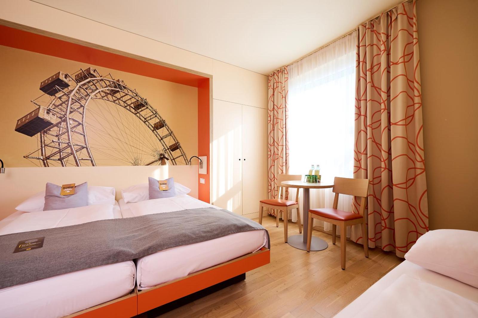The visuals at JUFA Hotel Wien City reflect its clean design and family-focused comfort. The central glass-roofed atrium creates a bright, open-air feeling as it anchors the hotel’s layout. Photos of guest rooms highlight the crisp bedding, uncluttered spaces, and soft, neutral palettes that define the property’s modern aesthetic.